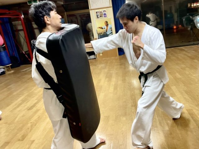 基本、移動基本、型、三本組手、ビックミット(肩甲骨の稼働、膝抜きからの体重移動を意識しての攻撃)を行いました。
