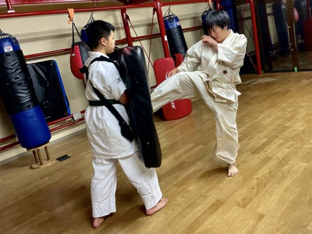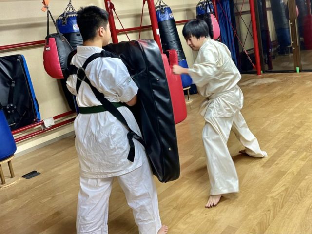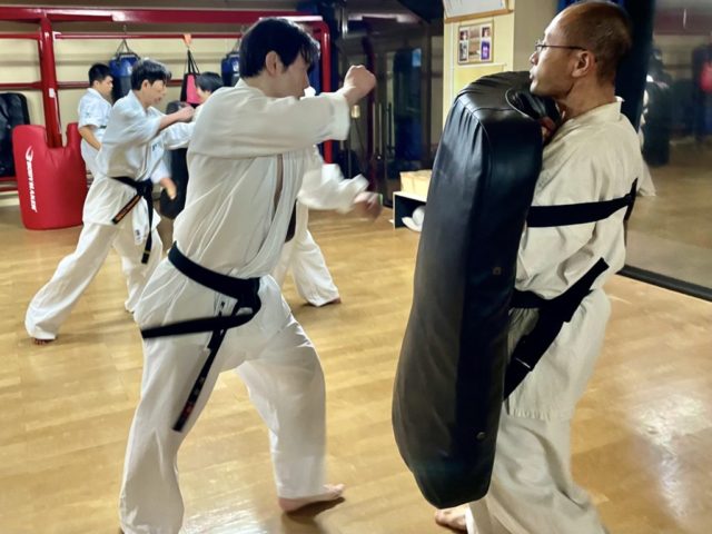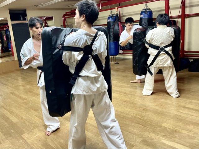 基本、移動基本、型、三本組手、ビックミット(肩甲骨の稼働、膝抜きからの体重移動を意識しての攻撃)を行いました。